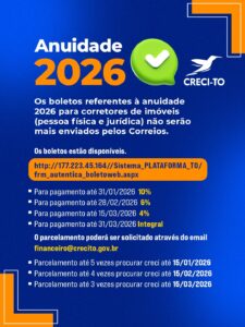 Em conformidade com as mudanças no sistema de emissão e registro de boletos bancários estabelecidas pela FEBRABAN, informamos que os boletos referentes à anuidade 2026 para corretores de imóveis (pessoa física e jurídica) não serão mais enviados pelos Correios.